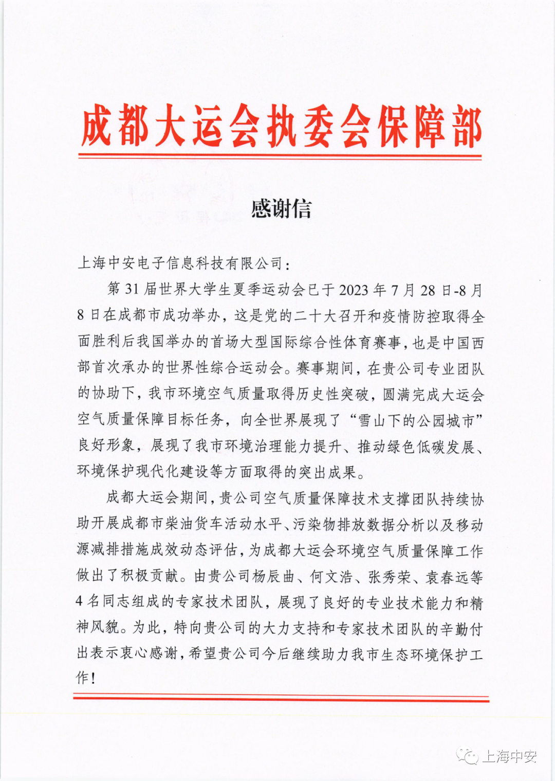 成都大運會執委會保障部發來一封感謝信!(2023-10-15)